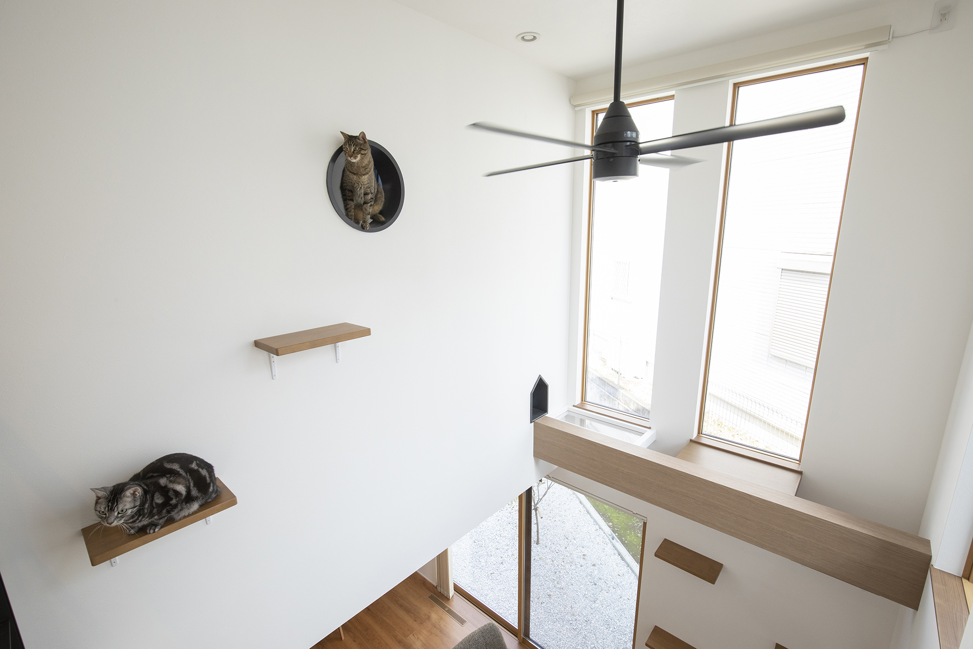 タテ移動や高いところが大好きな猫。キャットステップを吹き抜けにあるキャットウォークにつなげることで、より自由気ままに室内を移動することができます。