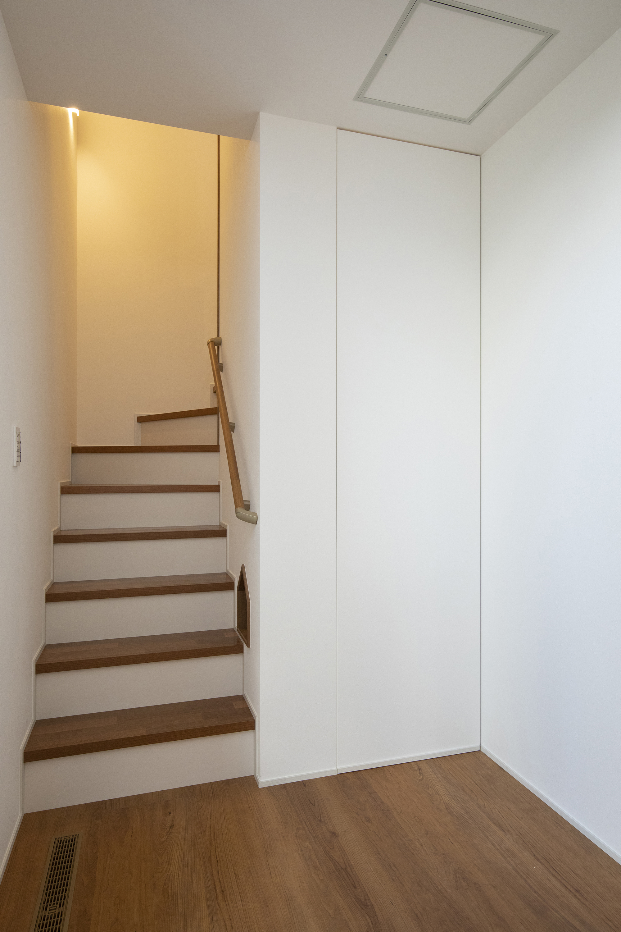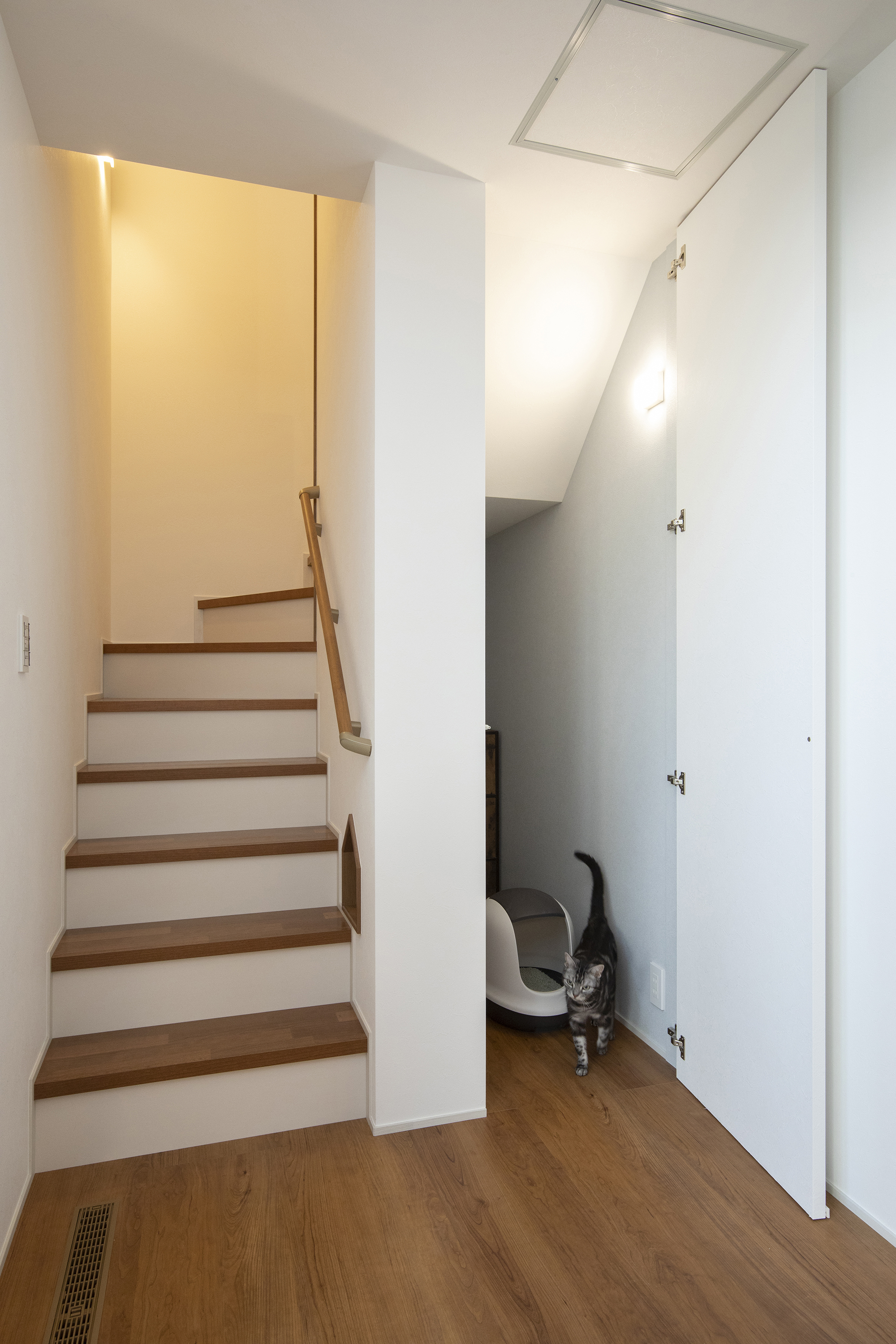 隠し扉がついた階段下のトイレコーナー。扉を閉めたままでも猫が出入りできるので見た目もすっきり、ニオイも気になりません。